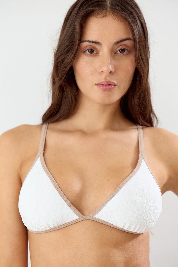Conjunto de corpiño triángulo fijo con almohadilla desmontable y less con regulación. Confeccionado en tricot texturado elástico para un calce cómodo y seguro.